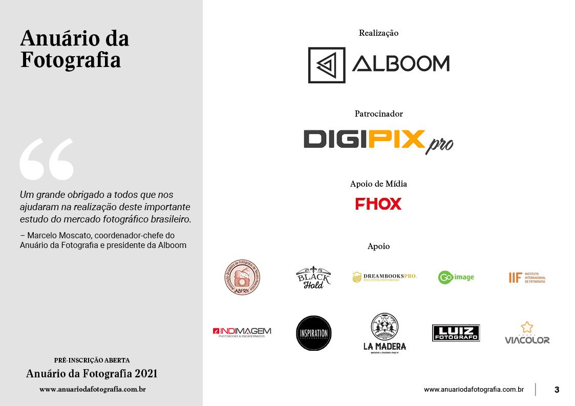 Este projeto começa com sua Primeira Edição 2020 com muito Conteúdo Relevante para não somente as grandes Empresas do Mercado da Fotografia, mas este Anuário se torna um Manual Importante para nós Fotógrafos, independente da Área que atuamos ou mesmo a nossa Localização neste imenso País.